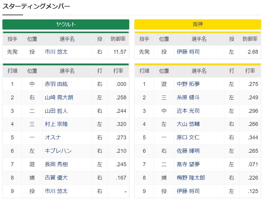 ヤクルトー阪神 スタメン 神宮球場 2022/9/28