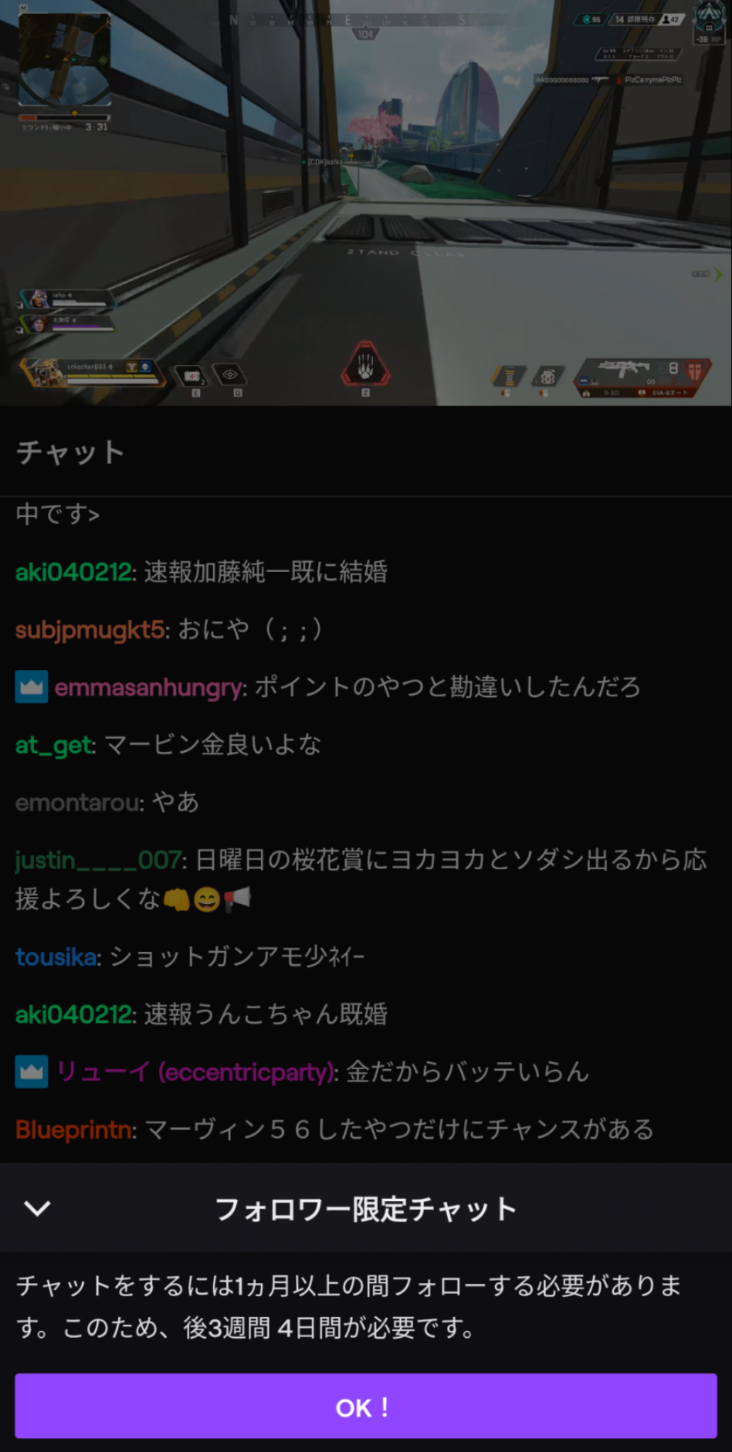 twitchで多いのはフォローしてから30分コメントできないが多いけど1ヶ月の配信者初めて見たわ
