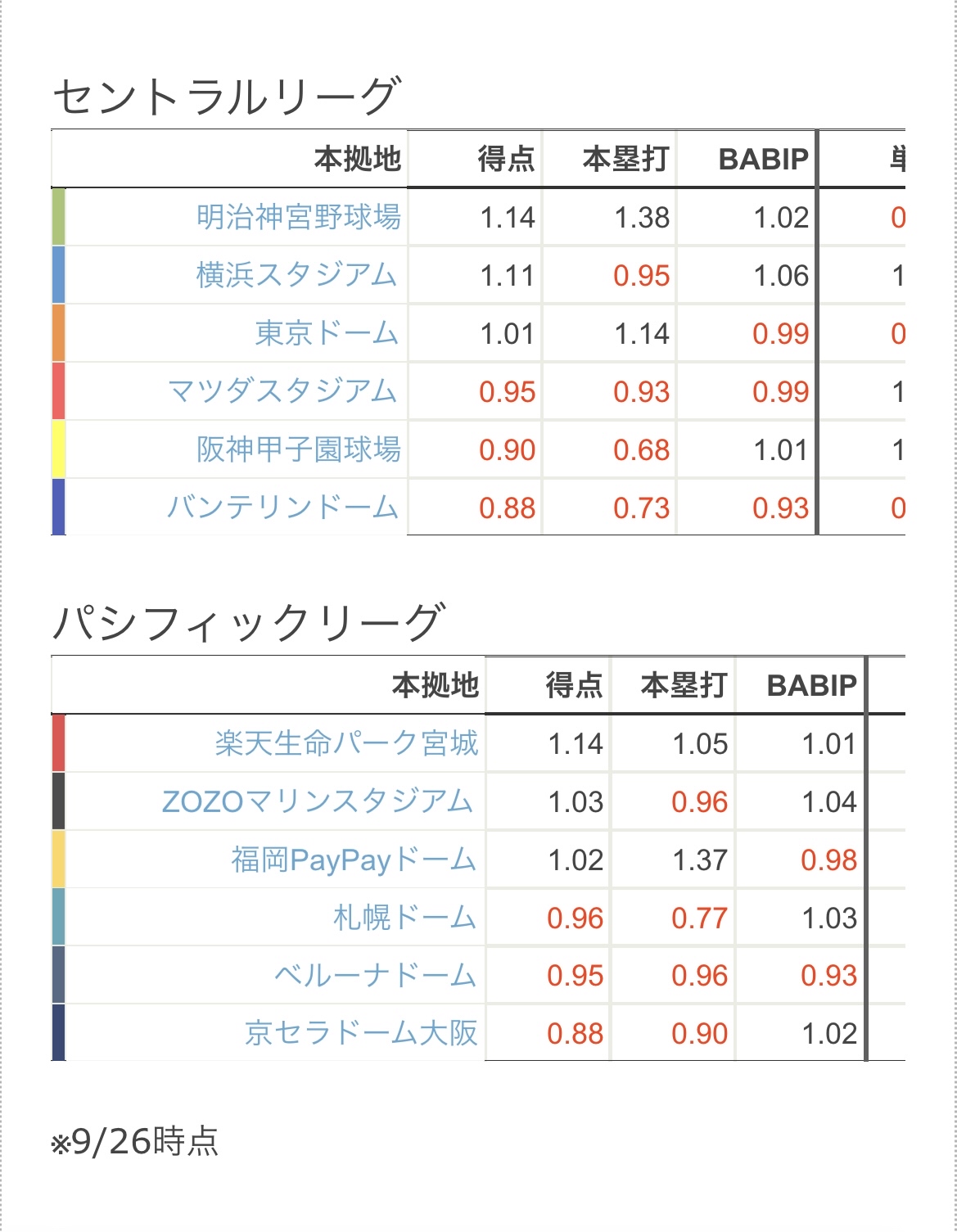 2022年12球団本拠地別パークファクターwwwwwwwwwwwwwwwwwwwwww