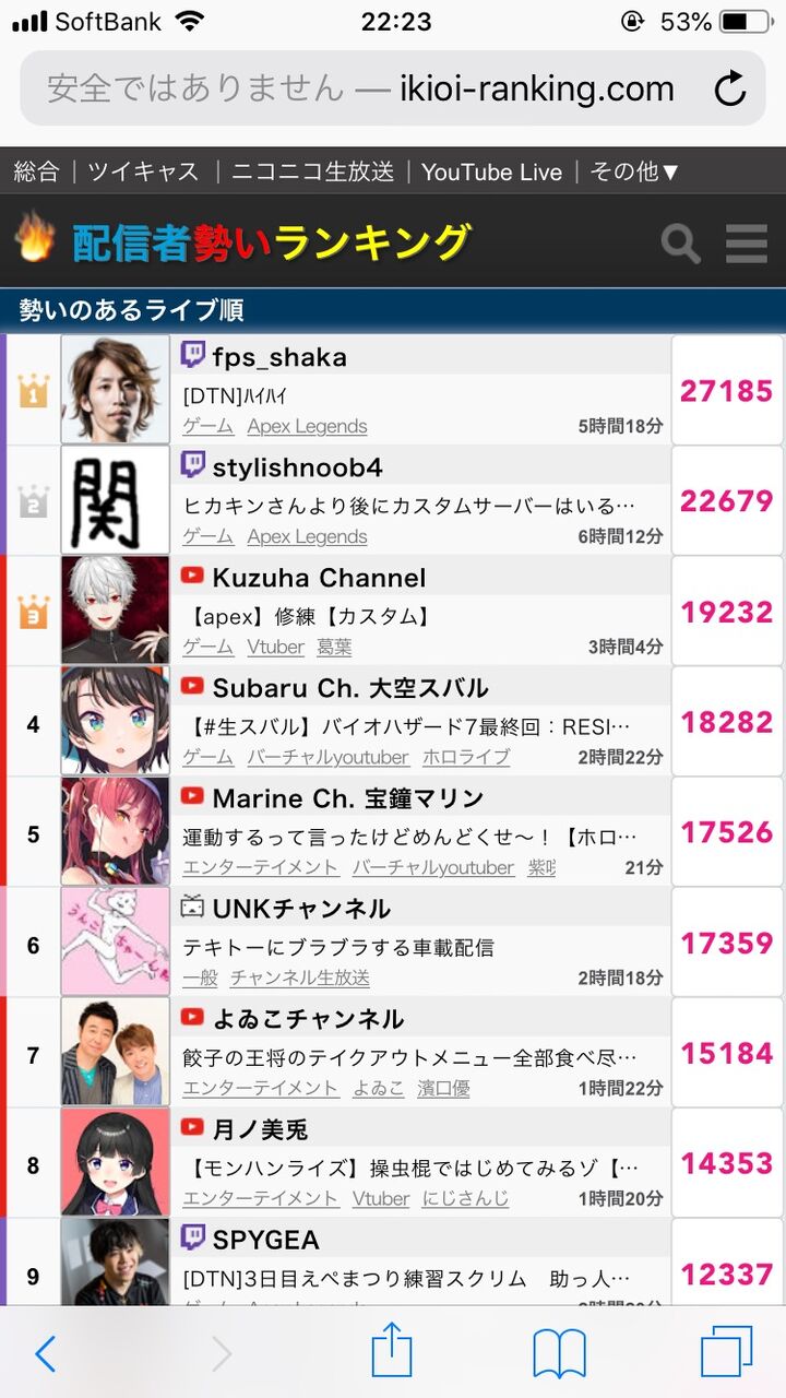 ニコ生だから同接出ないぞ その数値は見積もりでしかないし、そのサイトよりちくわちゃんランキングのほうがいい