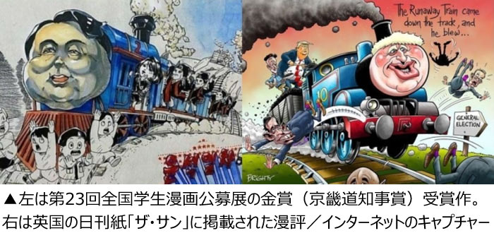 ネット掲示板などではこの作品について「2019年に英国の日刊紙ザ・サンに掲載された漫評『英国首相列車』とよく似ている」との指摘が広がっている。この漫評は2019年に発表されたもので、当時英国のジョンソン首相の顔をした汽車と、汽車の上に米国のトランプ前大統領とみられる人物が石炭を投入する様子が描かれている。ジョンソン首相はブレグジット(英国の欧州連合〈EU〉離脱)を強行するため総選挙の前倒しに乗り出したが、漫画はこれを批判するものだった。