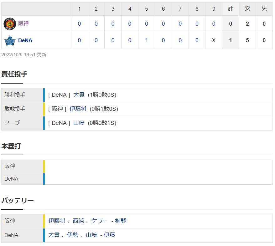 CSファーストステージ第2戦 DeNA1ー0阪神 試合結果 横浜スタジアム 2022/10/9