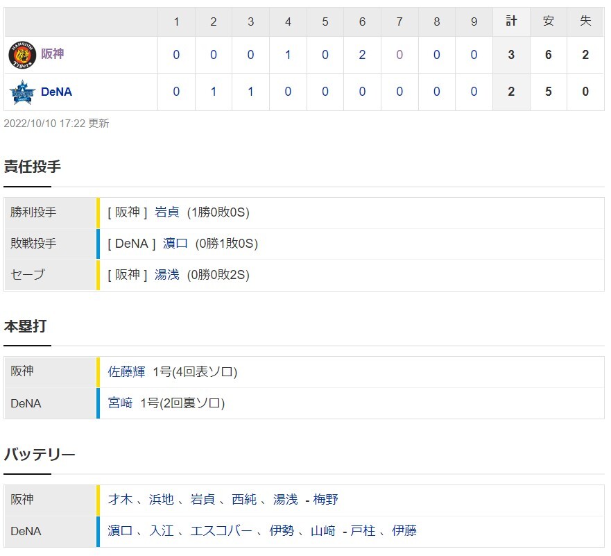 CSファーストステージ第3戦 DeNA2ー3阪神 試合結果 横浜スタジアム 2022/10/10