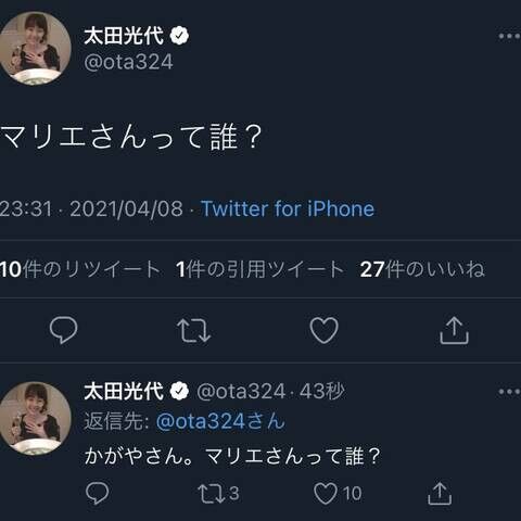 ラジオ発言の一人歩きにより、ネットではさらに騒動が大きくなることに。これを受けてか、光代夫人は4月8日夜にツイッターで、「マリエさんって誰?」と投稿。続けて、「かがやさん。マリエさんって誰?」「(..)誰?」と呼びかけていた。