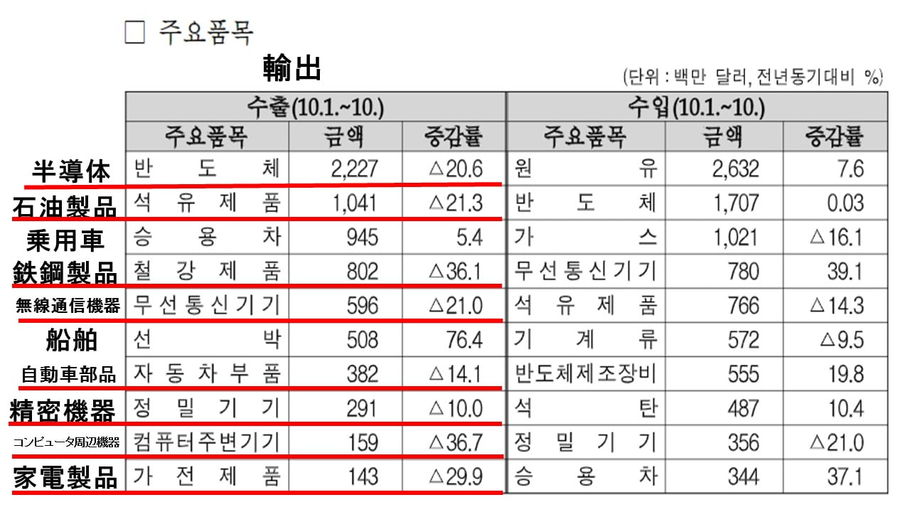 ⇒参照・引用元:『韓国 関税庁』公式サイト「’22年10月1日?10月10日の輸出入の現状」