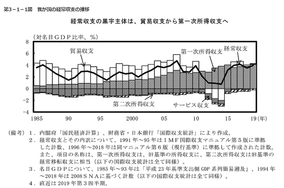 以下は内閣府の資料にある1985~2019年までの経常収支が分かる資料です。