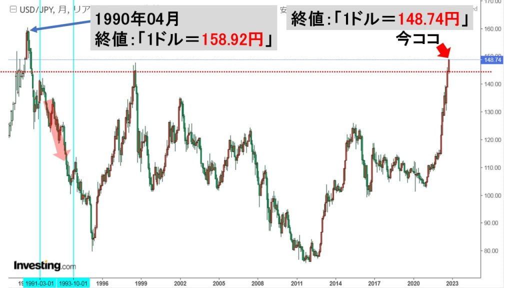 1990年04月の終値が「1ドル=158.92円」で、2022年10月13日の終値が「148.74円」です。確かに円安は似た水準に近づいています。