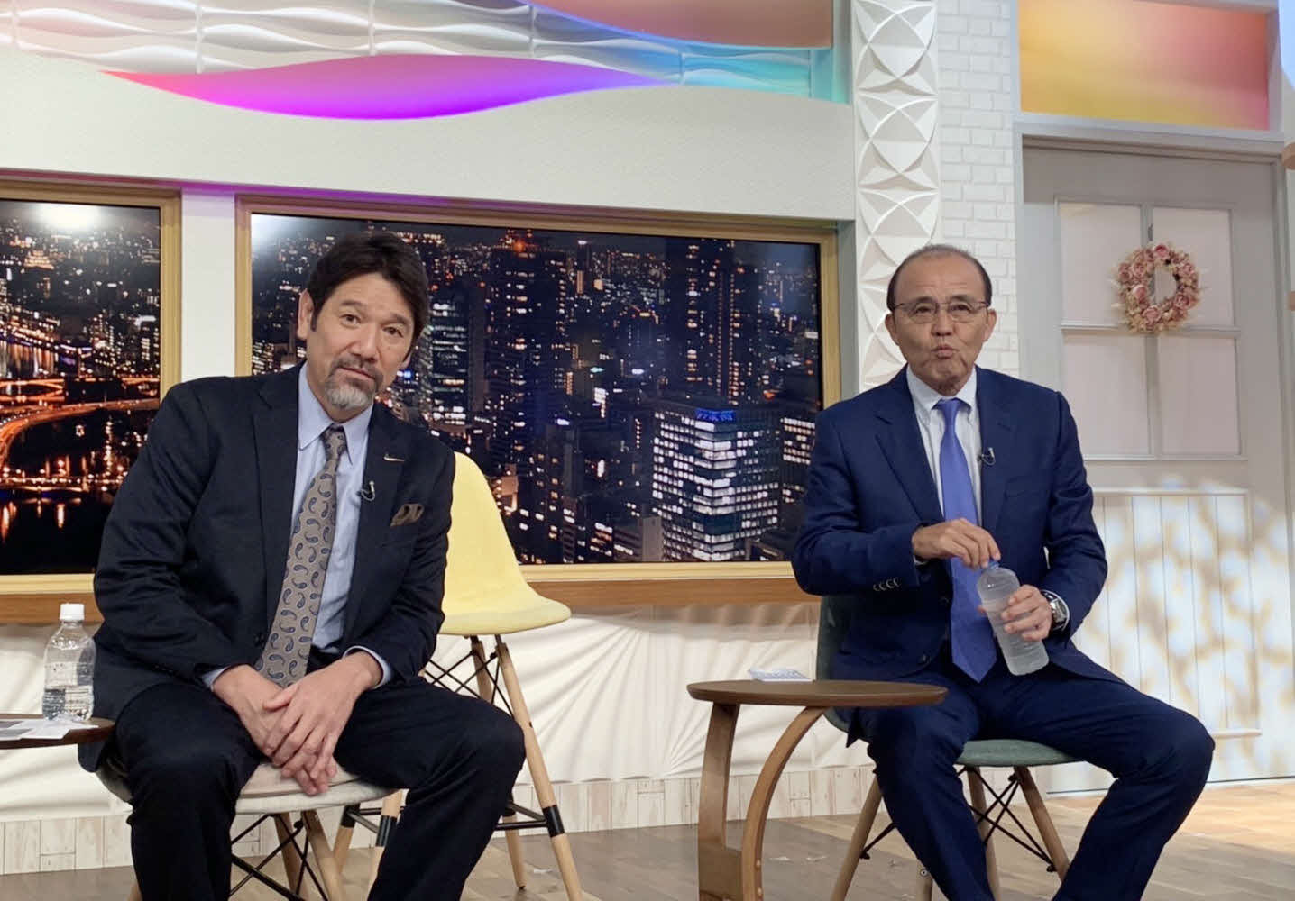 ABCテレビ「newsおかえり」に生出演した岡田監督(右)。左は下柳剛氏(球団提供)