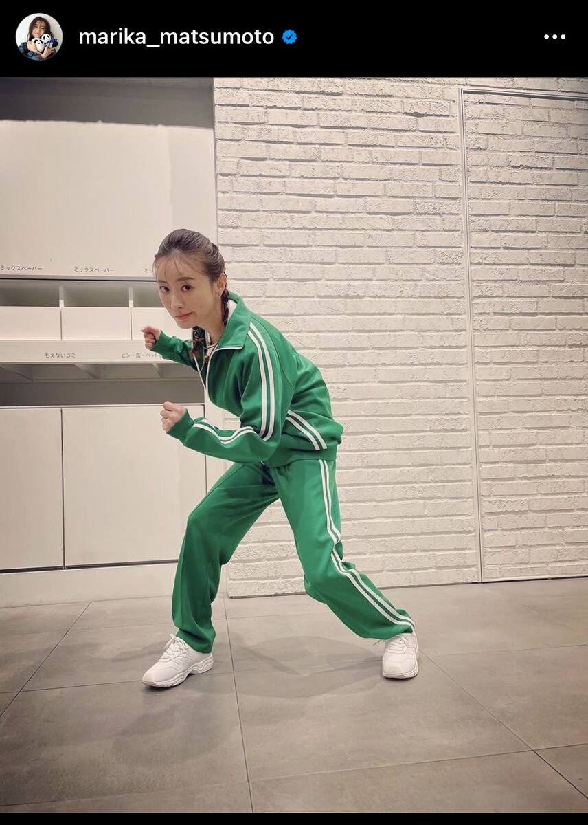 松本は「決意のジャージ。さりげなくリスタートしております一日一投稿。またやるぞ、の決意のジャージ。よしゃと決意しないと出来ないタチなので、よしゃと決意した」と緑色のジャージー姿を披露した。