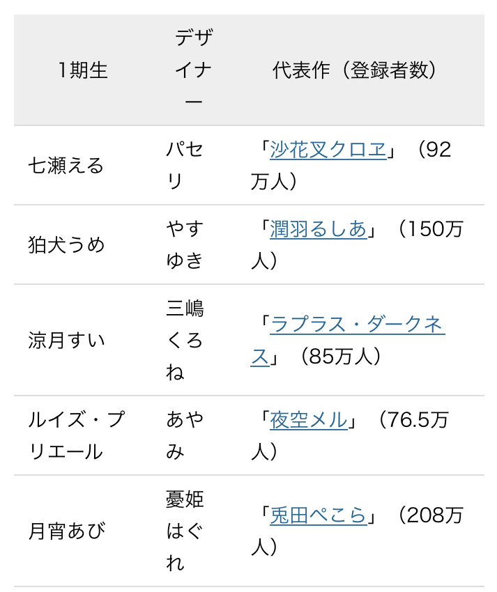 1期生として登場したのは「七瀬える」、「ルイズ・プリエール」、「狛犬うめ」、「月宵あび」、「涼月すい」の5名。