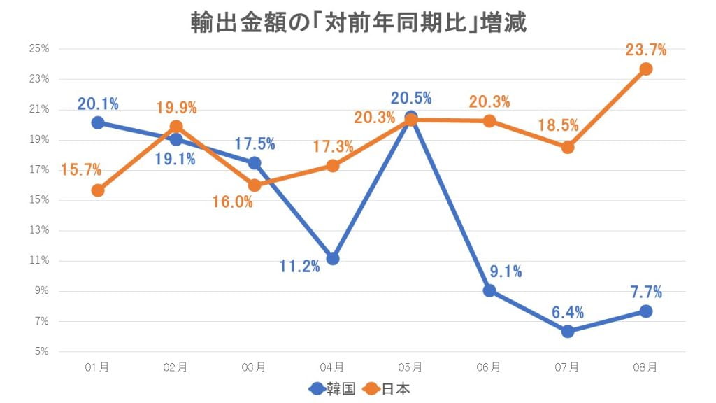 01~08月の韓国の輸出金額の「対前年同月比の増減」は平均「13.9%」、日本は「18.9%」です。