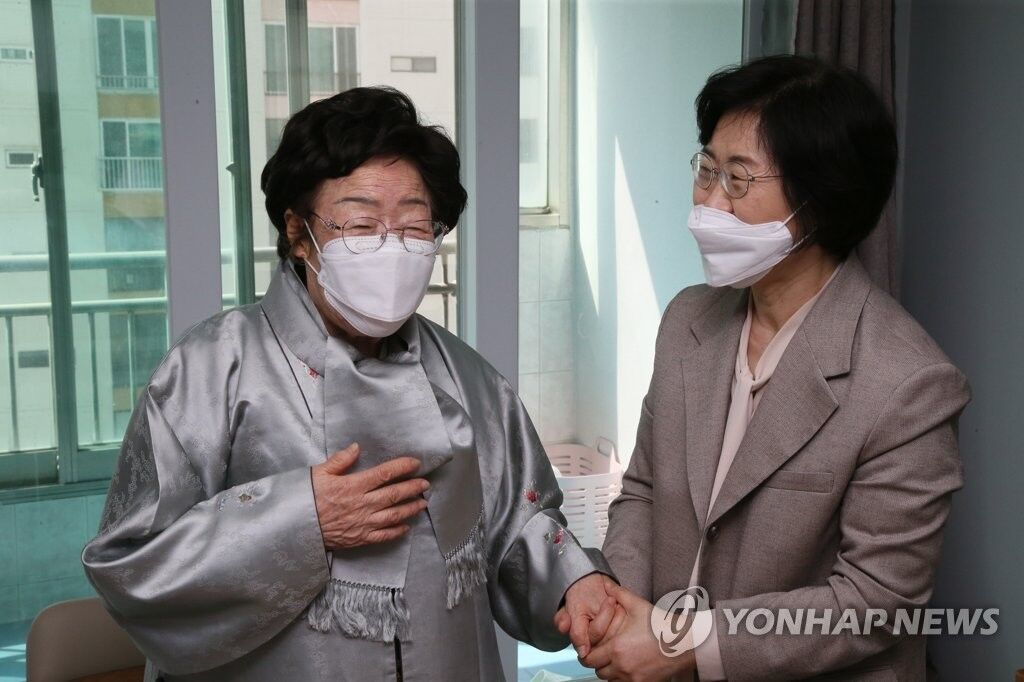 ▲今月7日、慰安婦被害者の李容洙(イ・ヨンス)さん(左)の住まいを訪ねた鄭英愛長官(女性家族部提供)=(聯合ニュース)