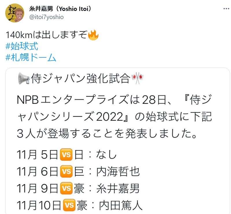 侍ジャパン強化試合2022 11月9日、糸井嘉男さん始球式「140㎞は出しますぞ」