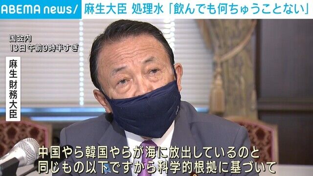 きのう(13日)日本経済新聞は、放射性物質であるトリチウムの含まれた処理水を海洋放流することを日本政府が決定した後、麻生副総理は「あの水を飲んでも何ちゅうことない」と語ったと報道した。