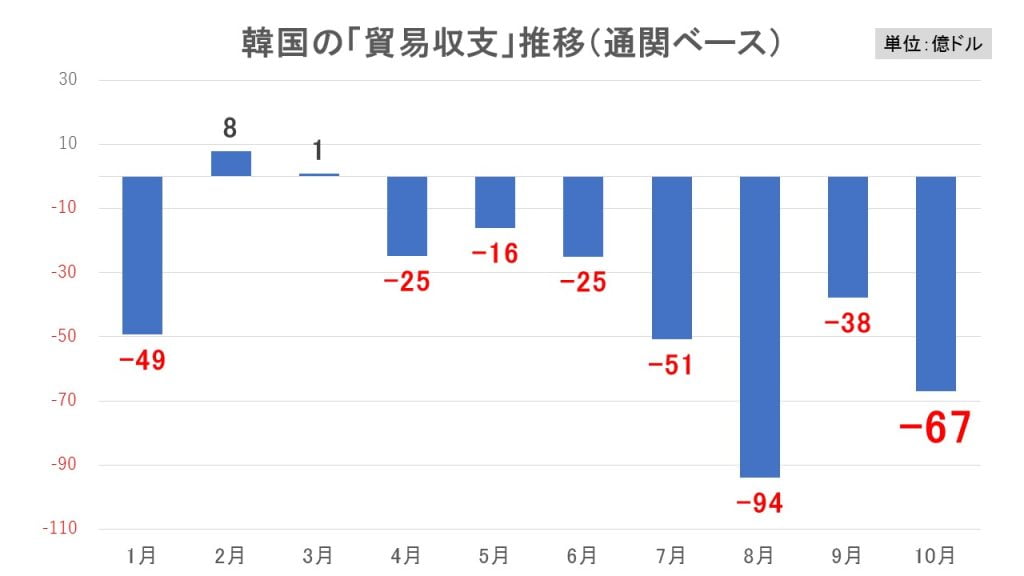 韓国「IMF危機時」を超えた7カ月連続赤字が確定!累計356億ドル赤字