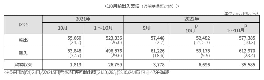 ⇒参照・引用元:『韓国 関税庁』公式サイト「’22年10月の輸出入の現状」