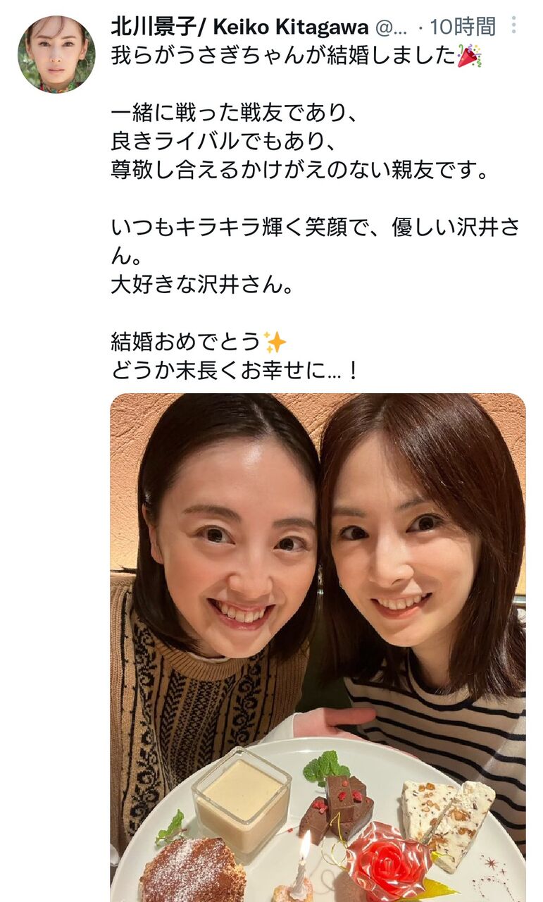 沢井さんの結婚発表後、北川さんはツイッターで「我らがうさぎちゃんが結婚しました 一緒に戦った戦友であり、良きライバルでもあり、尊敬し合えるかけがえのない親友です」と沢井さんとの、2ショット写真を添えてコメントしました。