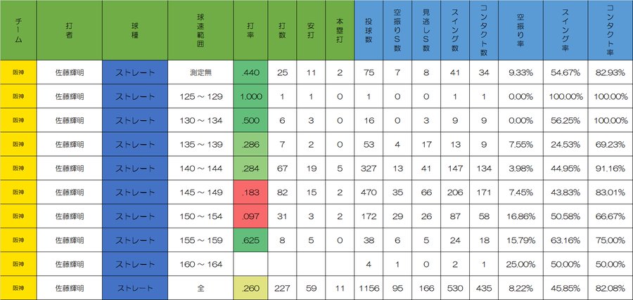 2022年佐藤輝明 ストレート球速帯別成績 https://t.co/NRJZeaklB7