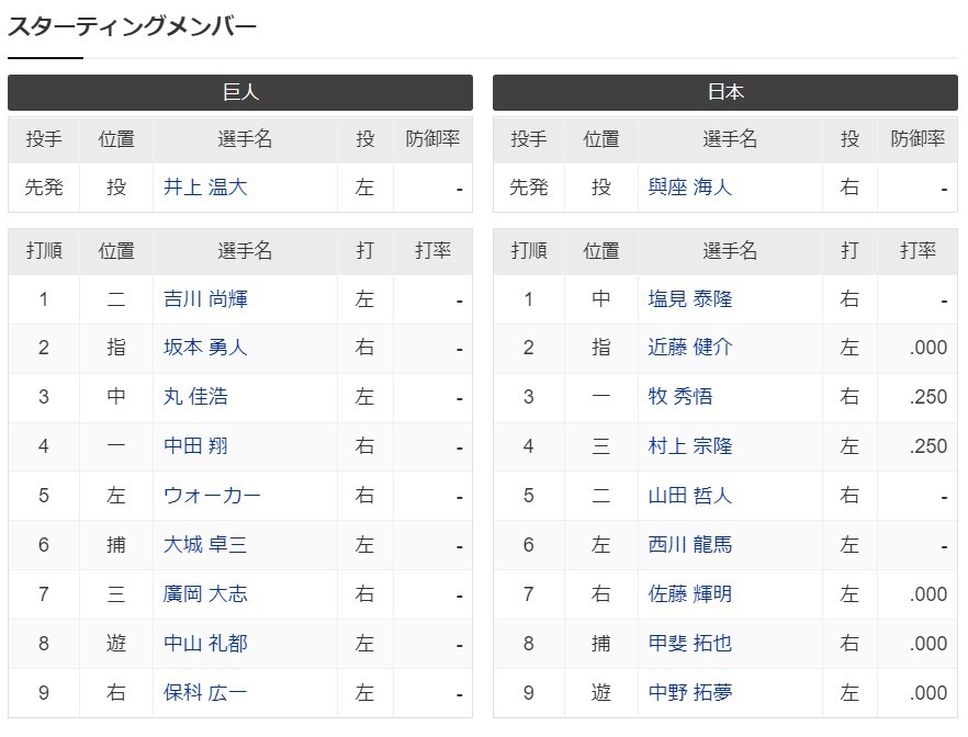 【TBS系,BS-TBS】巨人ー日本【侍ジャパン強化試合】スタメン発表