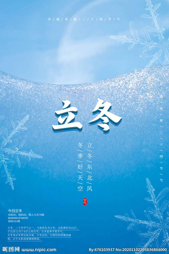 「秋分」(9月23日頃)と「冬至」(12月22日頃)の中間で、昼夜の長短を基準に季節を区分する場合、この日から「立春」(2月4日頃)の前日までが「冬」となる。