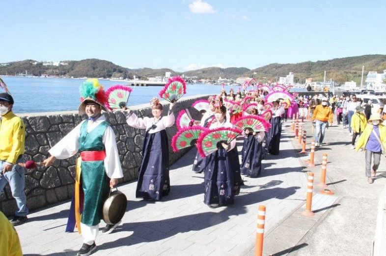 一行は、色鮮やかなチマ・チョゴリなど異国情緒あふれるいでたちで牛窓港近くの出島公園を出発。韓国の楽器演奏や舞踊を披露しながら海沿い約3・5キロを行進した。終了後は梁起豪(ヤンギホ)・駐神戸韓国総領事と武久顕也市長が「国書」を交換し、善隣友好の精神を確認した。