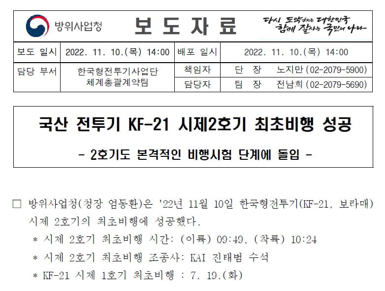 ⇒参照・引用元:『韓国 防衛事業庁』公式サイト「国産戦闘機KF-21時第2号機初飛行成功」