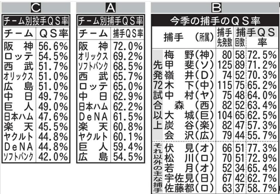 まずトップの捕手QS率を誇る梅野(阪神)が光ります。またAとの差を見ると、嶺井(DeNA)8・8ポイント増、中村(ヤクルト)3・9ポイント増、大城(巨人)3・1ポイント増、甲斐(ソフトバンク)2・7ポイント増と、よく試合を作っていることが数字に出ています。