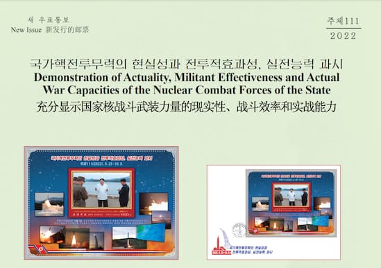 切手シートには金正恩(キム・ジョンウン)総書記が訓練を指揮する様子やミサイル発射の瞬間を撮影した写真が並ぶ。「国家核戦闘武力の現実性と効果、実戦能力を誇示」とのタイトルが入っている。