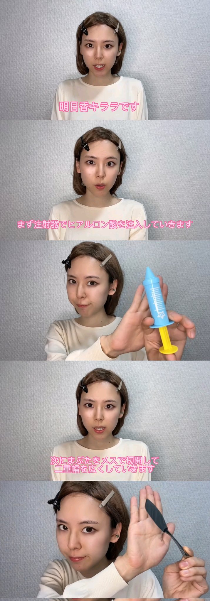 ちくわさんがYouTubeにアップした動画は、明日花さんのモノマネとして、「注射器を使いヒアルロン酸を注入する」「まぶたをメスで切開して二重幅を広くする」「医療用シリコンを入れて鼻のプロテーゼをする」「顎の骨を削る」といったフリをするもの。「顎の骨を削る」シーンでは「血が出ちゃう」という理由で花畑の映像が流れ、最終的には肌色の画用紙を顎や鼻に貼り付けた状態で「これで毎日メイクが終了です」と締めくくっている。