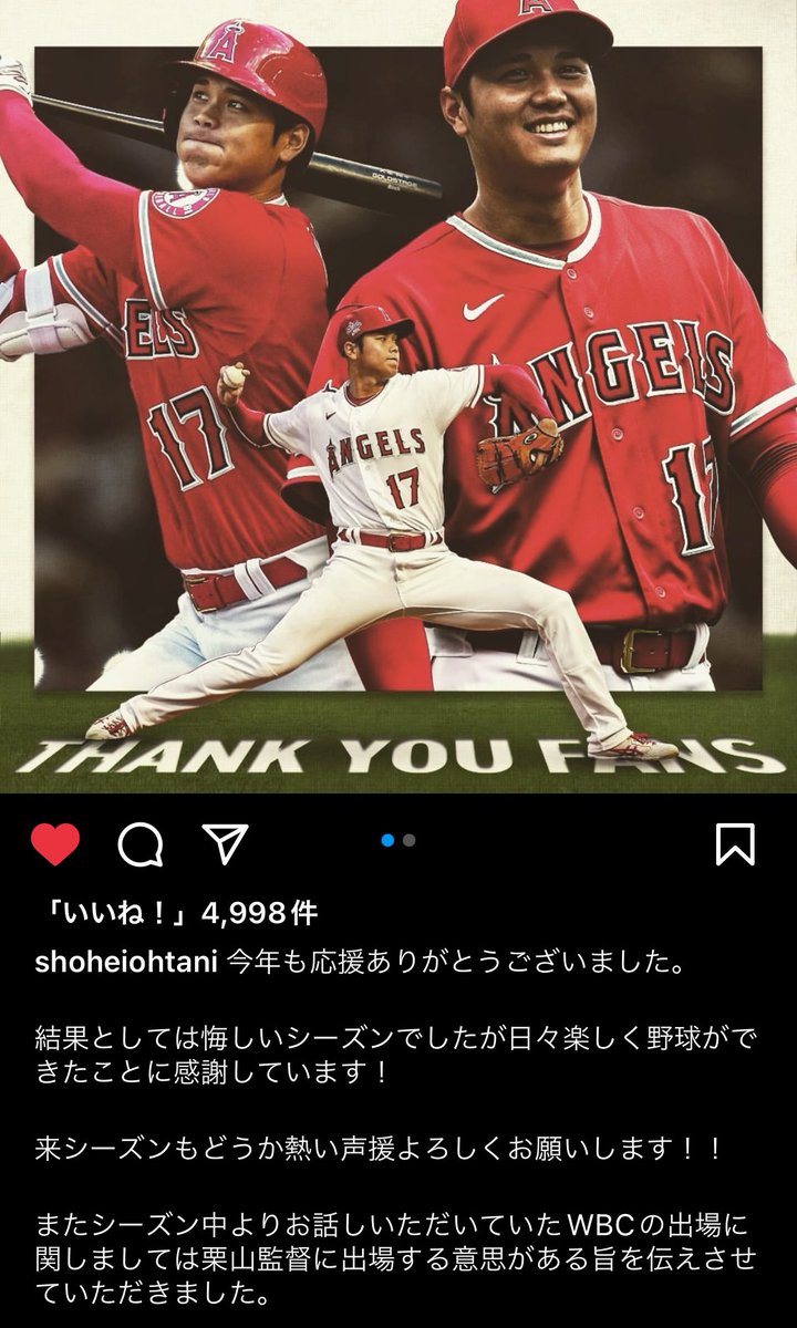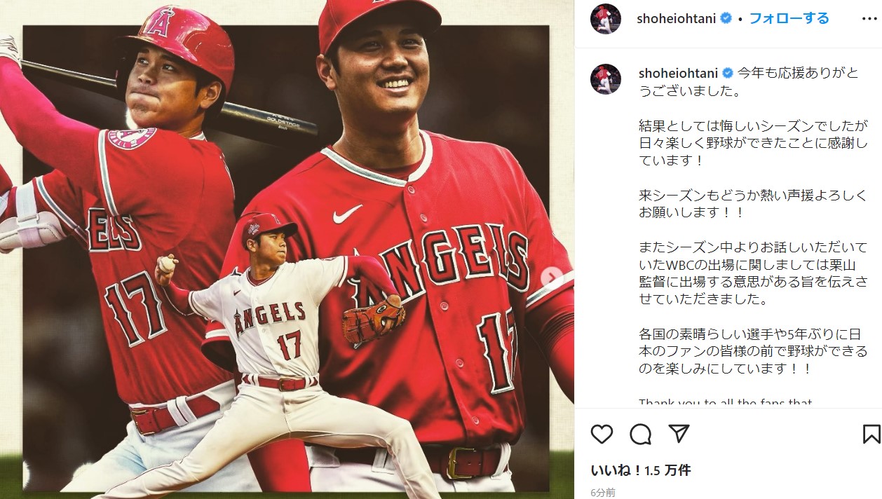 大谷翔平、自身のインスタグラムにてWBC出場意思を公式表明!!