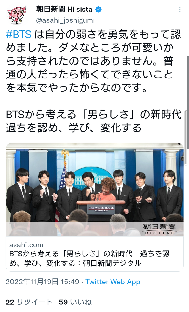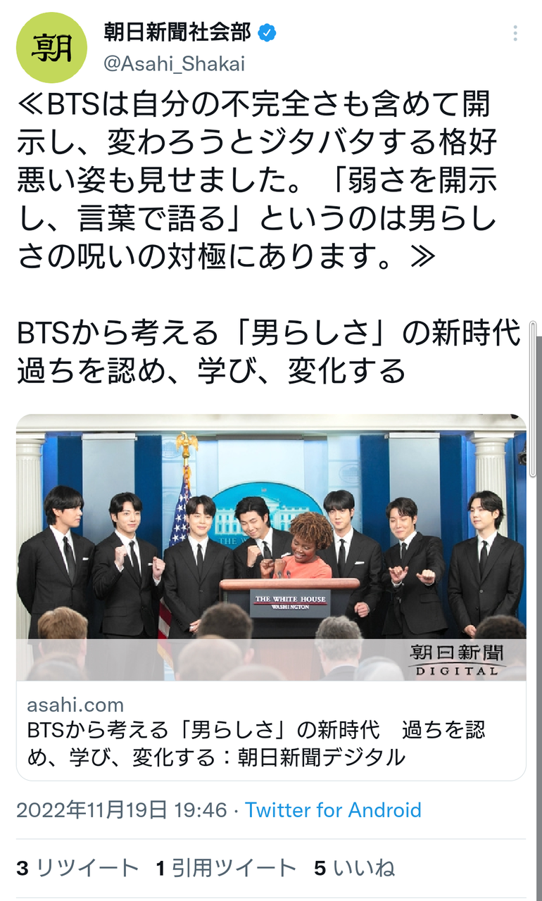 【朝日新聞/記事+ツイート2つ】BTSから考える「男らしさ」の新時代 過ちを認め、学び、変化する