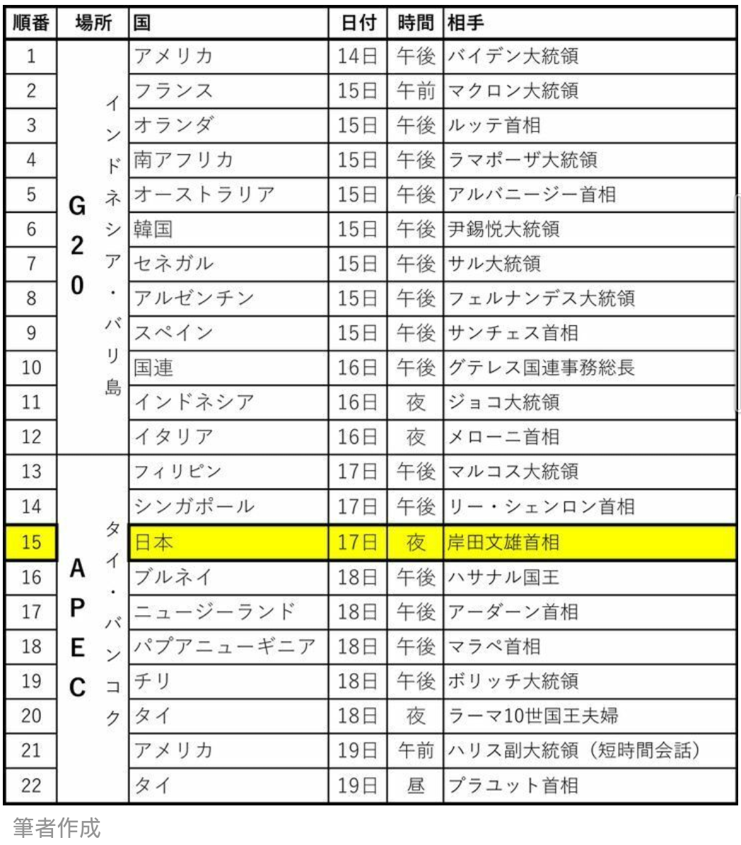 岸田首相が習近平と会談できたのはG20が終わった翌日11月17日にタイに移動してからだった。単純に国の順番から言うと、国連のグテーレス事務総長を含めて15番目となる。