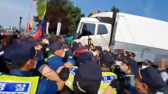 今年6月8日、警察はハイト真露の利川工場前で貨物車の進路をふさいだ民主労総公共運輸労働組合貨物連帯の組合員15人を逮捕した。[写真 京畿南部警察庁]