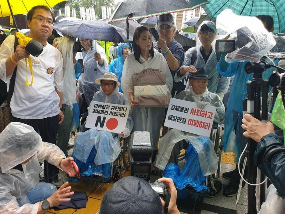 19年8月、ソウル日本大使館前で会見する強制徴用被害者の梁錦徳(ヤン・グムドク、中央左)さんと李春植(イ・チュンシク)さん。93歳の梁さんは「謝罪なくしては死んでも死にきれない」と明かす。筆者撮影。