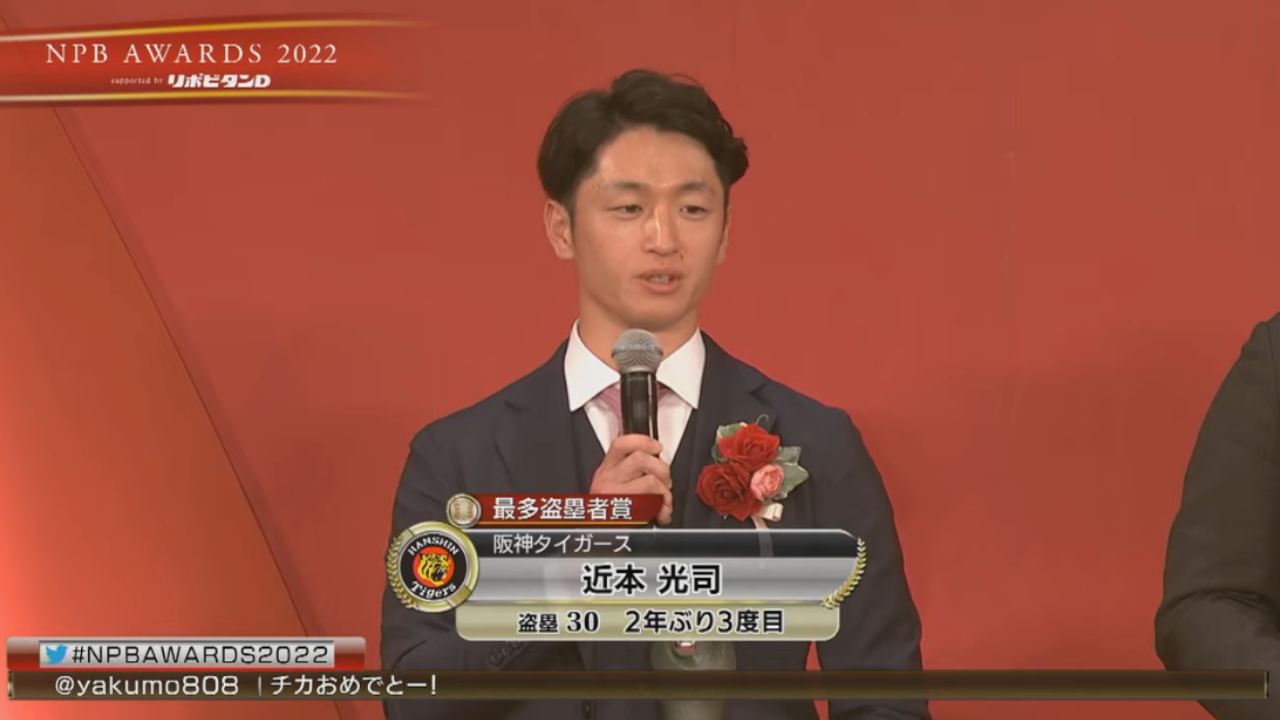 阪神の近本光司外野手(28)が、最多盗塁者賞、ベストナインを受賞した。