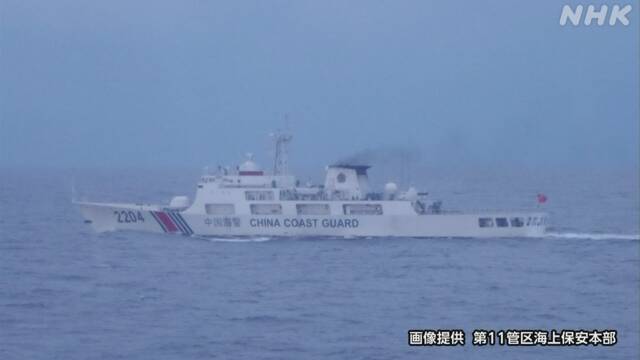 25日午前、沖縄県の尖閣諸島の沖合で、従来より大型の76ミリ砲を搭載しているとみられる中国海警局の船が日本の領海に侵入したのが初めて確認されました。その後、領海から出ましたが、すぐ外側にある接続水域を航行していて、海上保安本部が警戒を続けています。