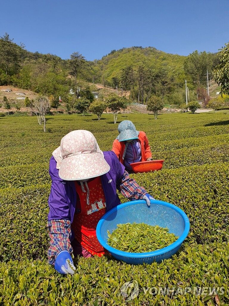 穀物を潤す雨が降る時期とされる二十四節気の「穀雨」を翌日に控えた19日、韓国南西部・全羅南道宝城郡の茶畑で茶摘みが最盛期を迎えている。海洋性気候と大陸性気候がぶつかるこの地域は、霧が多く茶の栽培に適している。穀雨の前に摘んだ茶葉は「雨前茶」と呼ばれ、最高級品の緑茶として販売される(宝城郡提供)=(聯合ニュース
