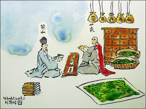 ▲茶を楽しんだタサンチョン・ヤギョンとチョイソンサ(草衣禪師) (絵イ・ムソン作家)