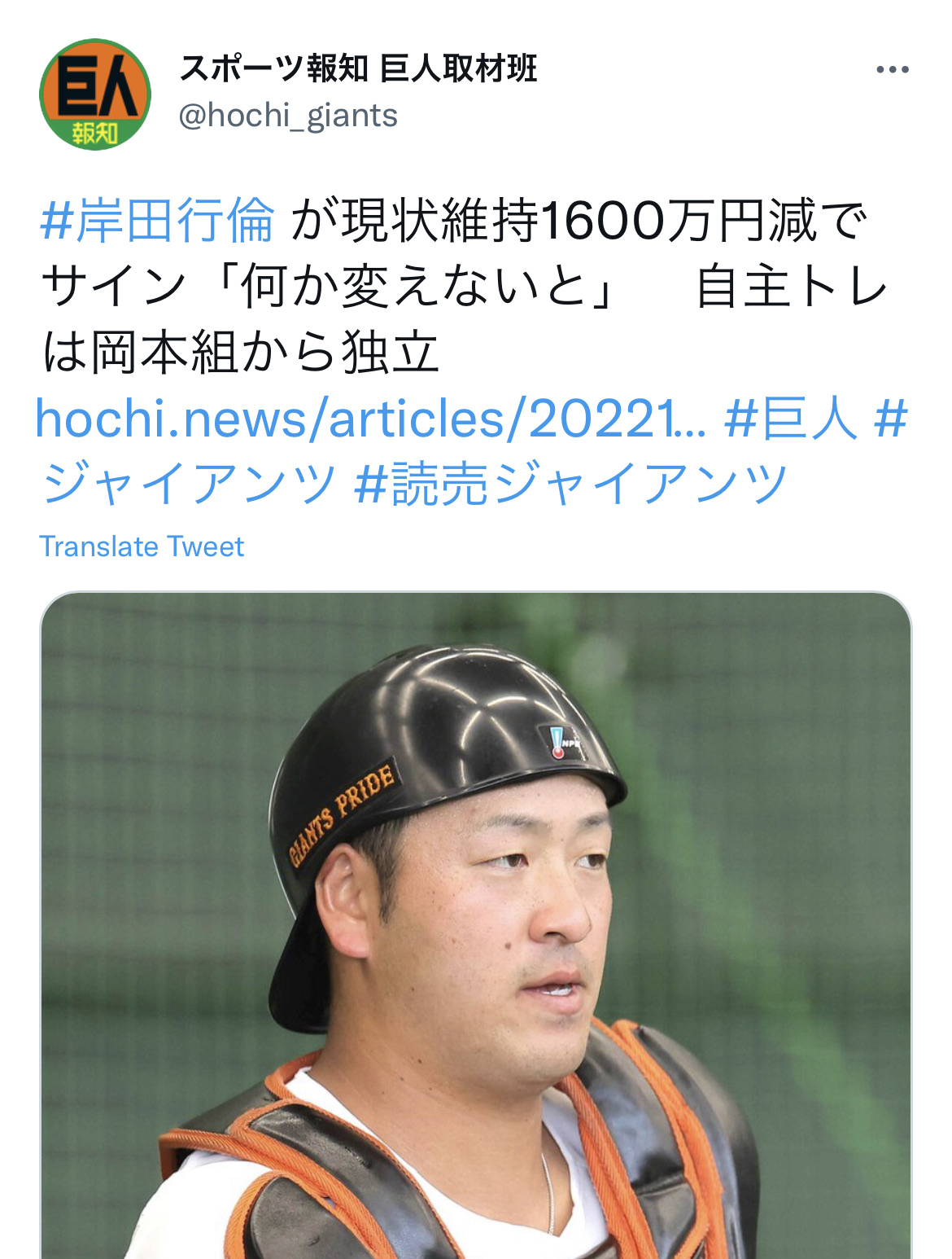 スポーツ報知 巨人取材班@hochi_giants#岸田行倫 が現状維持1600万円減でサイン「何か変えないと」 自主トレは岡本組から独立 https://t.co/m18c7DwrO9 #巨人 #ジャイアンツ #読売ジャイアンツ https://t.co/I0Eky5AYXQ2022/11/26 16:15:33