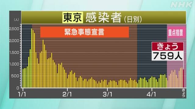 東京都は、23日午後3時時点の速報値で、都内で新たに759人が新型コロナウイルスに感染していることを確認したと発表しました。都内では感染が拡大していて、金曜日に700人を超えるのは、およそ3か月前の1月29日以来です。