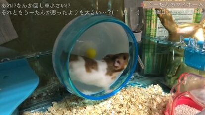 投稿者のノイジーワールドさんがお迎えしたハムスターのうーたん。他の子より大きな体も一目惚れの要因だっただけに、ちょっと回し車が小さいような。この後急いで大きな回し車を買いに行ったそうです。