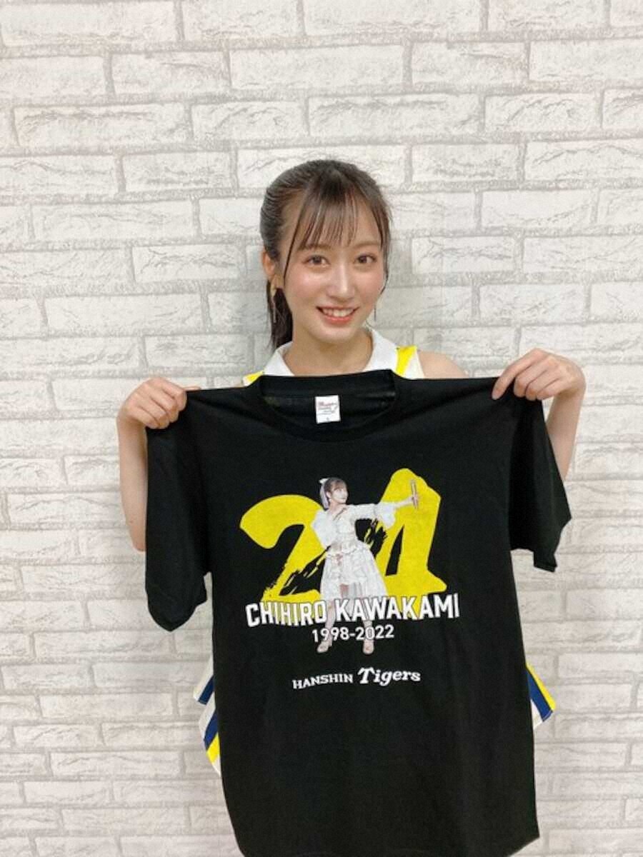 熱心な虎党で知られるNMB48の川上千尋と阪神タイガースとの初のコラボグッズが発売されることが決まった。29日に行われた「川上千尋ファン感謝デー」のイベント内でサプライズ発表。川上は公演後に自身のツイッター上でも「ファン感の最後に川上千尋×阪神タイガースコラボ生誕Tを発表しました 正式な阪神グッズです ぜひGETしてください」と呼びかけた。