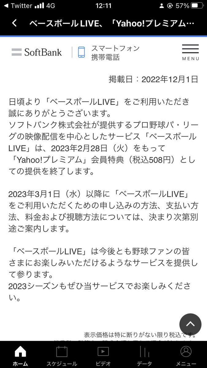 【悲報】ベースボールLiveがヤフープレミアム特典での提供を終了