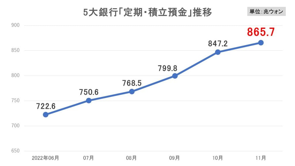 2022年11月末時点での、韓国の5大銀行、『国民銀行』『新韓銀行』『ハナ銀行』『ウリィ銀行』『農協銀行』の定期預金・積立預金残高は、865兆6,531億ウォンと集計されています。