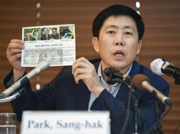 北朝鮮の体制批判ビラを掲げる韓国の脱北者団体「自由北韓運動連合」の朴相学代表=2020年7月、ソウル(共同)