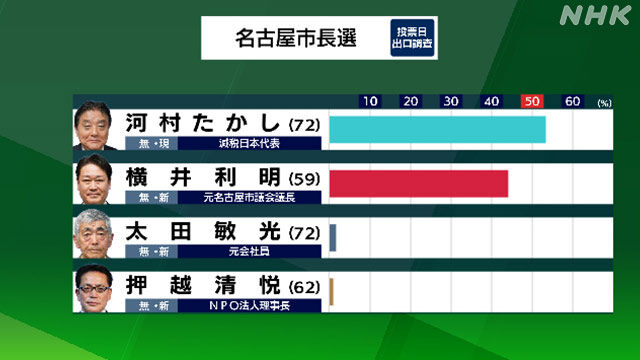 名古屋市長選挙は、NHKが行った出口調査や開票所の取材などで、4期目を目指した、現職の河村たかし氏が、今後、順調に得票を伸ばすと見込まれることから、当選を確実にしました。