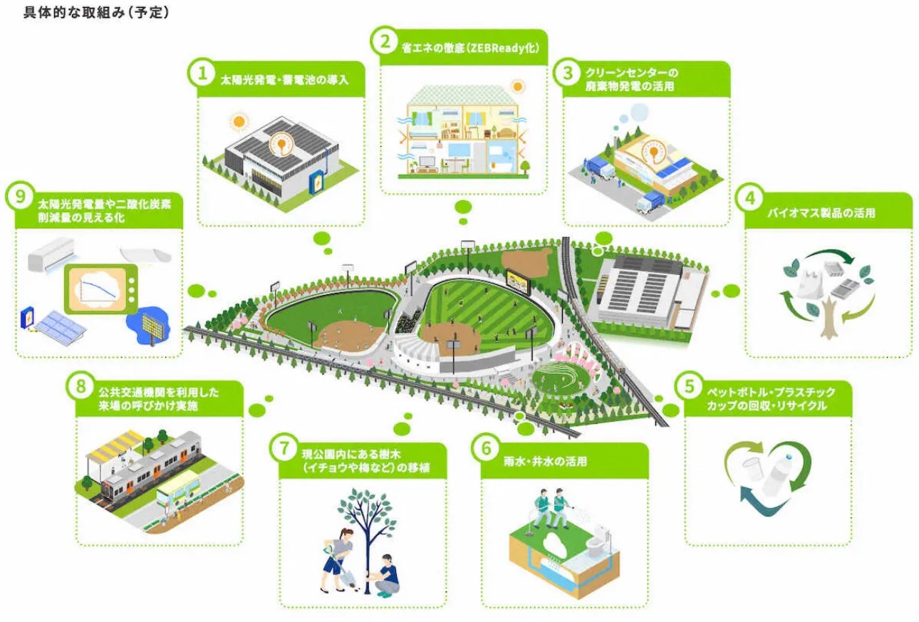 室内練習場や選手寮兼クラブハウスの屋上、野球場のバックスクリーン背面に太陽光パネルを設置。ここからの発電、蓄電により、野球場で想定する年間電力使用量の80%強相当を創エネする。不足分は、尼崎のクリーンセンターの廃棄物発電による二酸化炭素排出ゼロ電力を活用する。