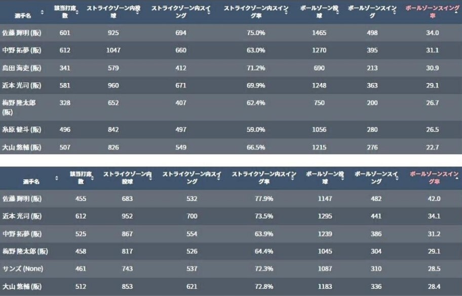 ルーキーイヤーは「何でもかんでも振る」「どのボールにも手を出す」という印象が強かったが、共同通信デジタルによるとボールゾーンスイング率が42%から34%へと減少。つまりゾーン外のボール球に対して極力我慢しながら、勝負していたというのが見て取れる。本人が「気持ちの中であんまり三振したくないみたいな」と明かしたように、確実性を追い求めたシーズンだった。