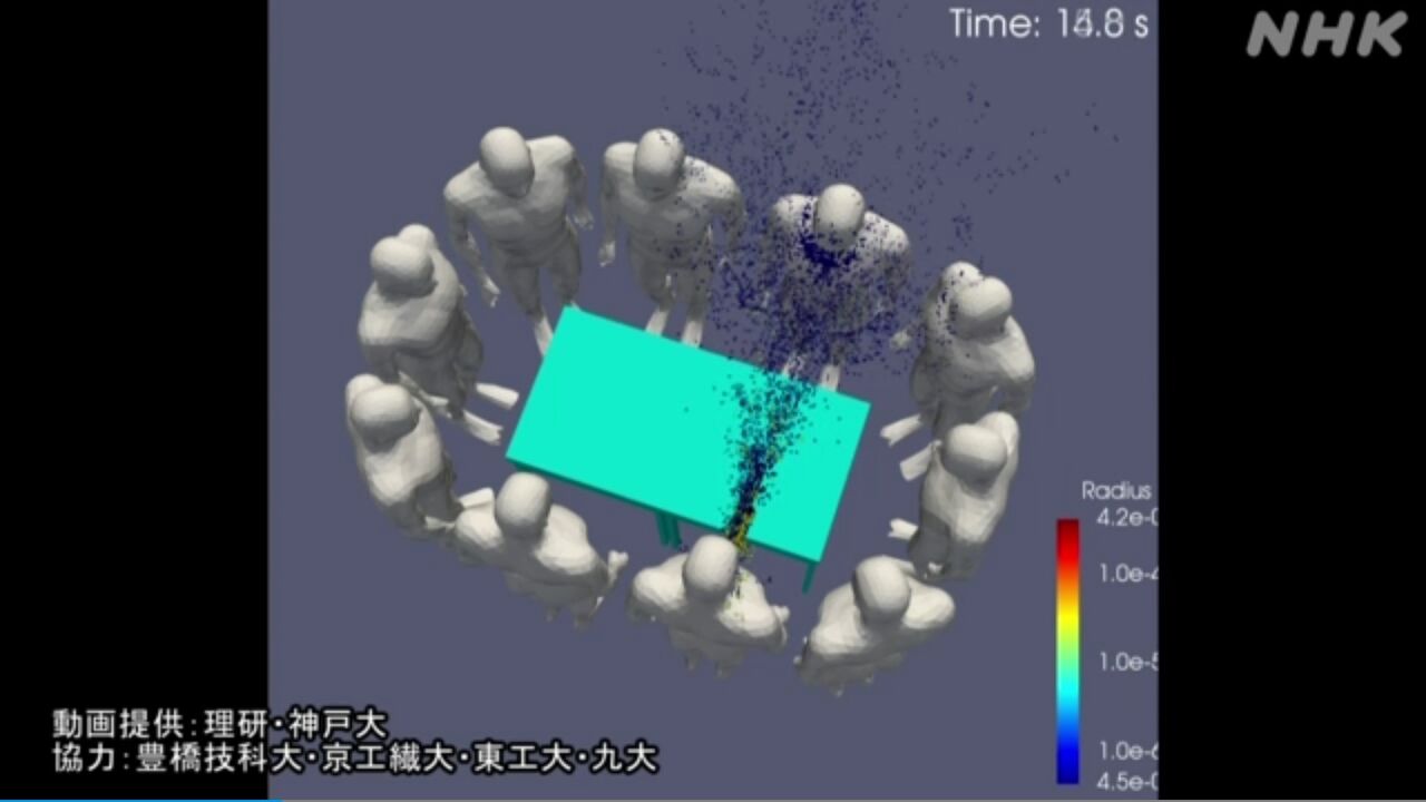 また、毎秒0.5メートルのそよ風が吹いている場合は、小さな飛まつは周辺に広がり、正面や風下にいる人など合わせて6人が飛まつを浴びたということです。
