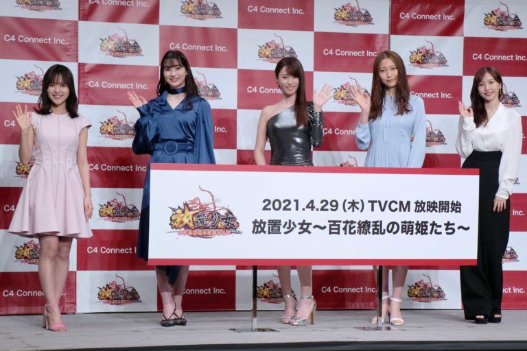 女優の深田恭子、足立梨花、大野いと、佐野ひなこ、新田さちかが26日、都内で行われたRPGゲーム『放置少女~百花繚乱の萌姫たち~』の新CM発表会に参加。